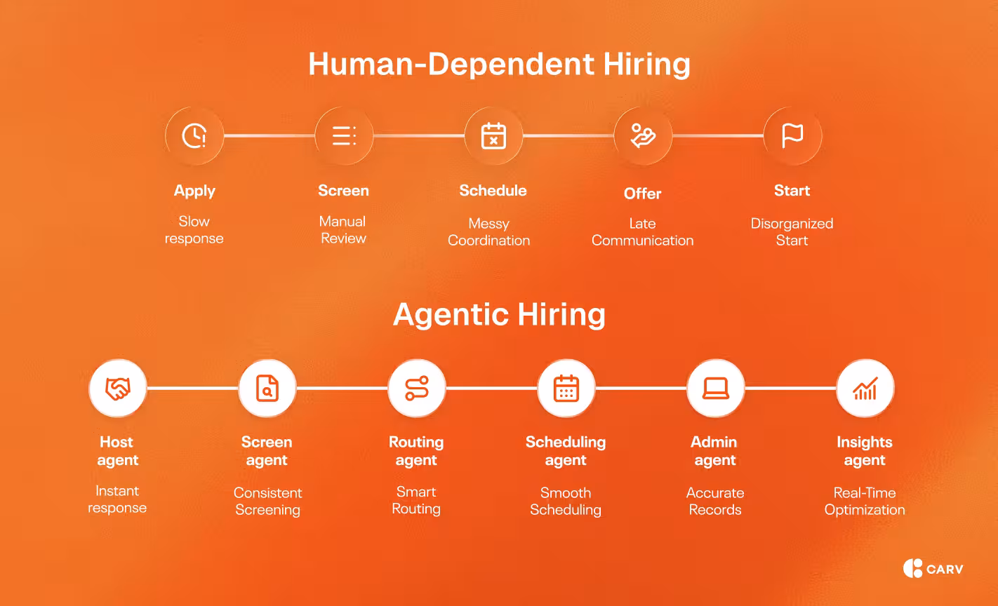 AI-agents are changing the game by injecting decision-making intelligence into end-to-end hiring workflows. That way, momentum isn't derailed by a lack of human availability.