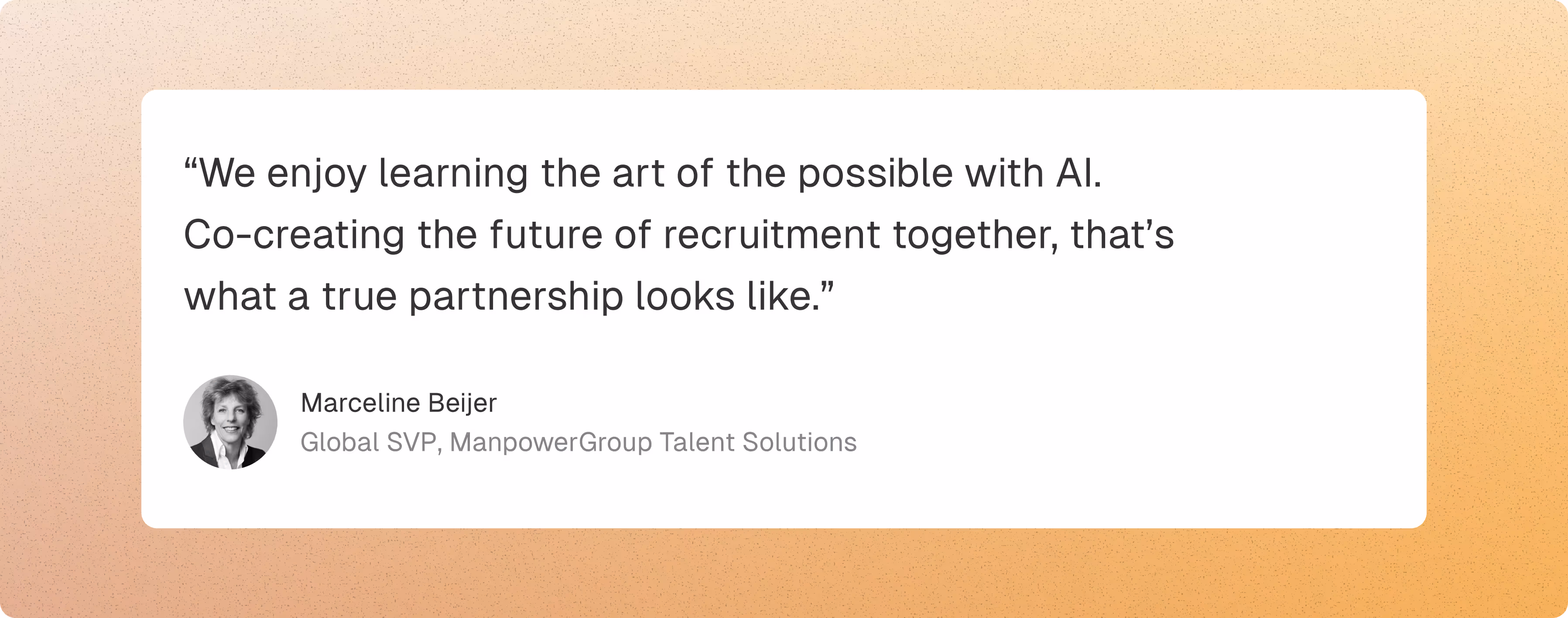 ManpowerGroup partnered with Carv to explore how agentic AI could be woven directly into their operating model. This partnership was built through custom solution design. Business leaders, recruiters, and Carv’s AI engineers designed their desired future state together, mapping every stage of the hiring journey and identifying where intelligence could create meaningful, sustainable impact.